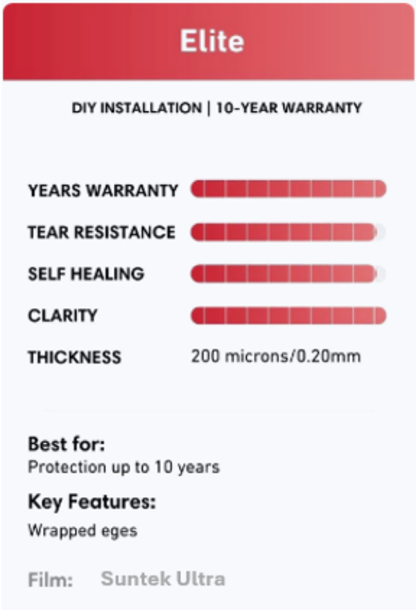 - Elite: 3M Scotchgard Paint Protection Film Series 150, best quality film which has excellent scratch & stain resistance, it has also excellent self-healing abilities. This film comes with a 10 year warranty.